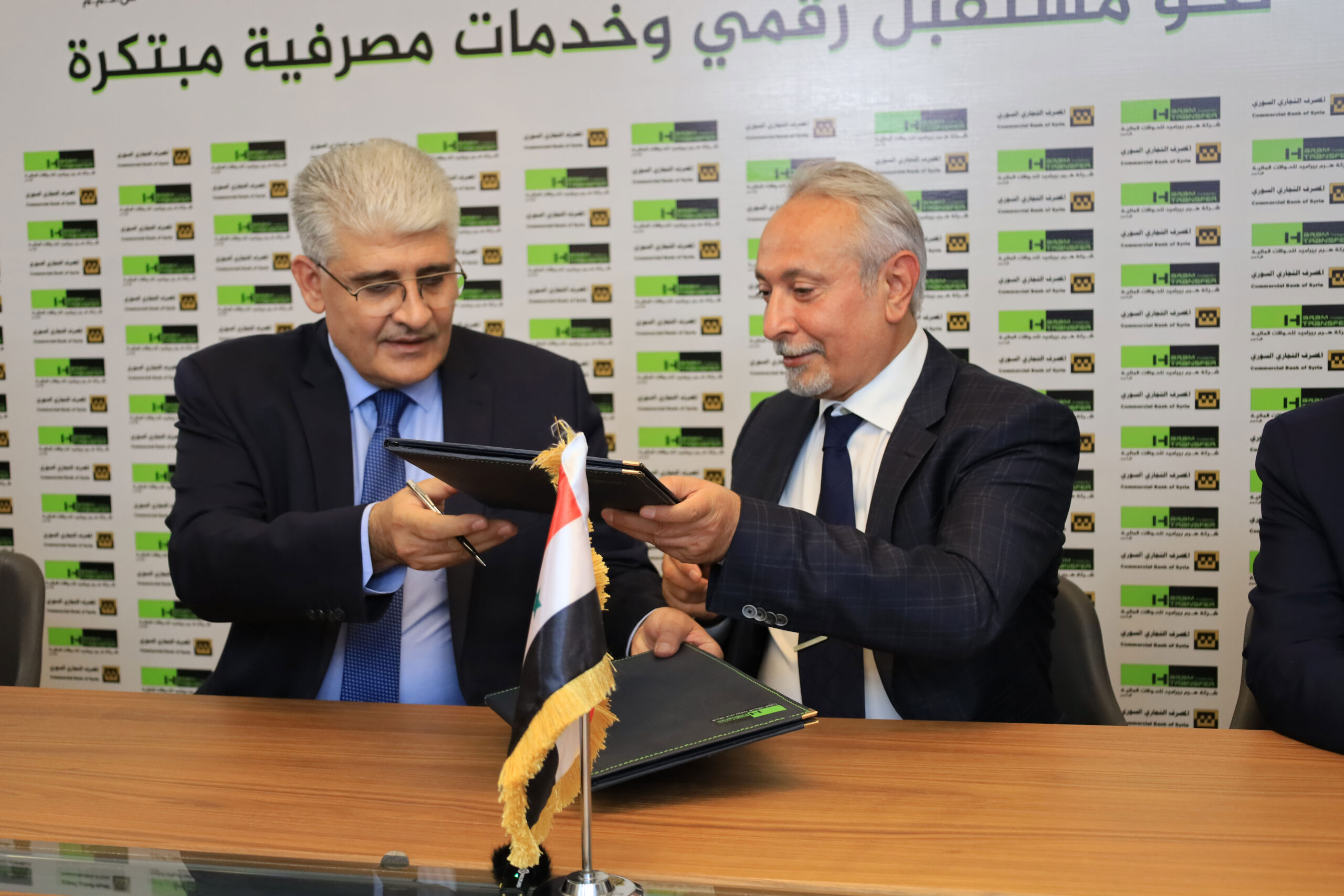 وتم توقيع الاتفاقية بين المصرف التجاري السوري ممثلاً بمديره العام الدكتور علي يوسف وشركة هرم بيراميد للحوالات المالية ممثلة برئيس مجلس المديرين السيد فؤاد عاصي خلال حفل أقيم في مقر شركة الهرم اليوم السبت برعاية مصرف سورية المركزي وحضور السيدة ميساء صابرين / النائب الأول لحاكم مصرف سورية المركزي والسيد بسام الزراد / نائب حاكم مصرف سورية المركزي.