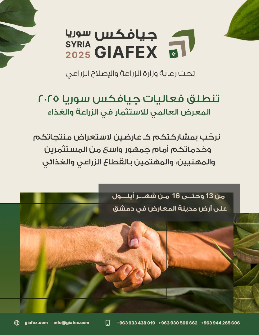 وشدد مدير شركة” الحسام للمعارض” على أن الاستثمار الزراعي يجب أن يكون شاملاً، يبدأ من الأرض وينتهي بالمنتج المُصنّع القابل للتصدير، كما هو الحال في الدول المتقدمة وقال.. “الأمل كبير في أن تستعيد سوريا مكانتها الريادية في المجالين الزراعي والصناعي، كما كانت في سبعينيات القرن الماضي، بفضل الدعم الحكومي والتوجه نحو استثمار طويل الأمد يحقق التنمية ويُعيد إحياء الأراضي الزراعية”.