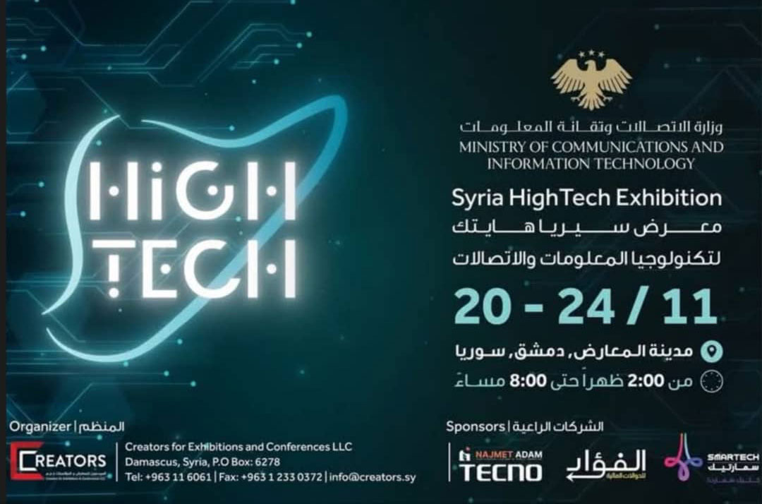 برعاية وحضور وزير الاتصالات عبد السلام هيكل وحضور المهندس سامي سميرات وزير الاقتصاد الرقمي والريادة الأردني والدكتور محمد نضال الشعار وزير الاقتصاد والتجارة الخارجية السوري و الدكتور مروان الحلبي وزير التعليم العالي والبحث العلمي والمهندس محمد عنجراني وزير الإدارة المحلية والبيئة والأستاذ رائد الصالح وزير الكوارث والطوارئ والأستاذ محمد حسان السكاف وزير التنمية الإدارية تنطلق غدا فعاليات معرض”سوريا هاي تِك” للتكنولوجيا والاتصالات” في مدينة المعارض دمشق .